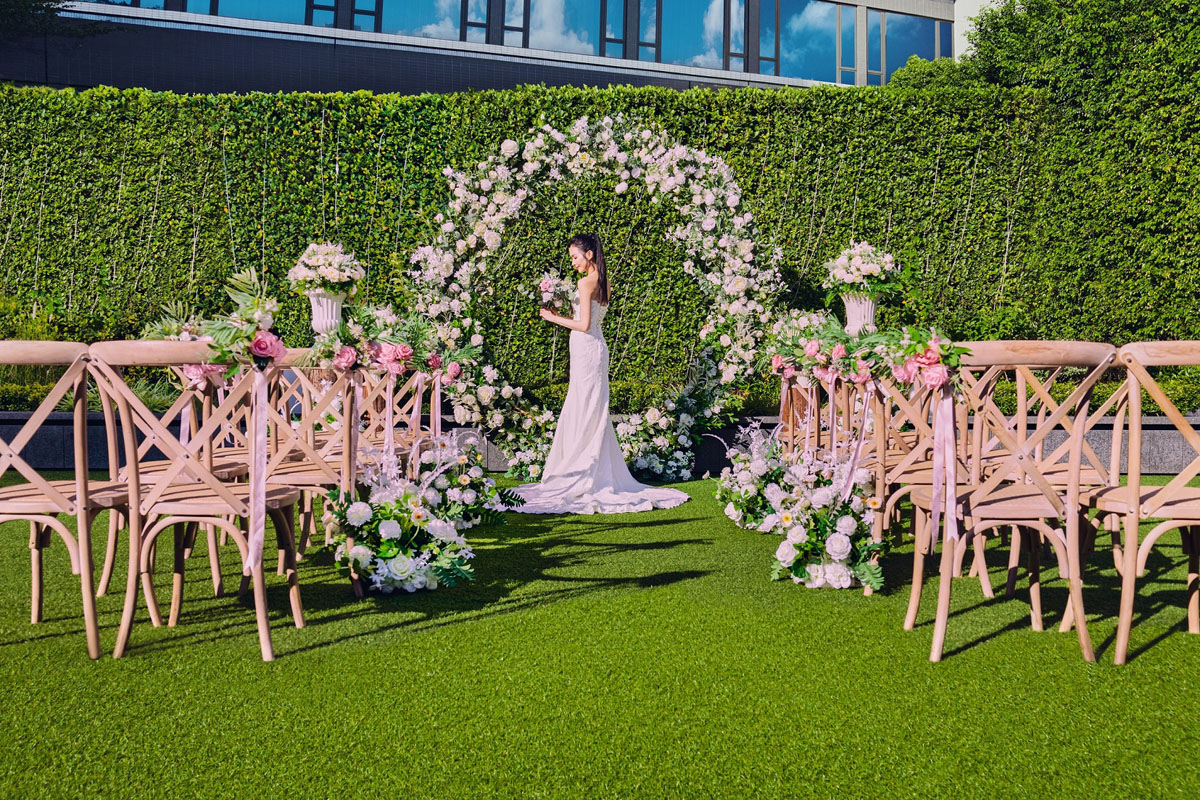 - 以優惠價HK$16,888 (原價HK$32,880) 租用3/F戶外證婚場地連場地佈置,包括婚禮拱門、行禮通道椅花、迎賓桌、證婚桌、油畫架及新人名牌 (需另加一服務費)